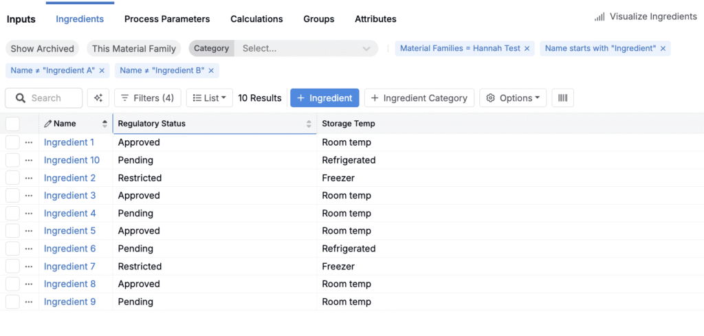 - Filter the Ingredient listing — Filter the Ingredients listing to show only the ingredients you just imported.