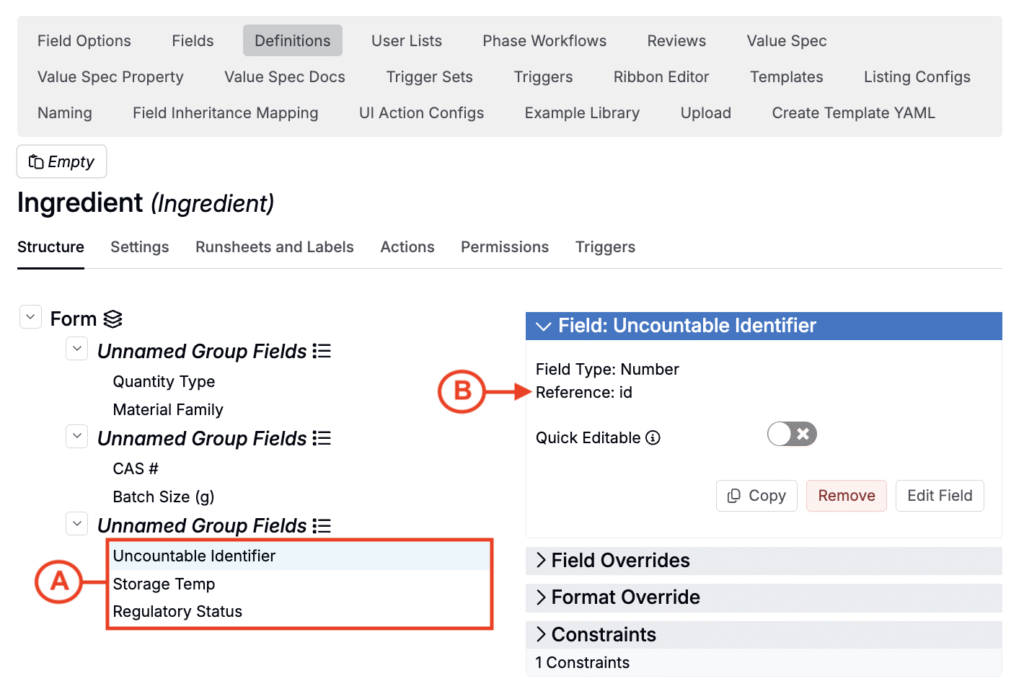 Note: Ingredient fields must already exist and be added to the selected ingredient definition before you import field values (A). To view an ingredient field’s ref name select the field on the definition itself and look for “Reference” (B).
