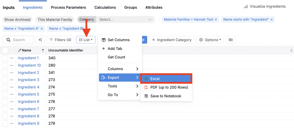- Export the configured Ingredient List — Use List → Export to export the filtered list to Excel.