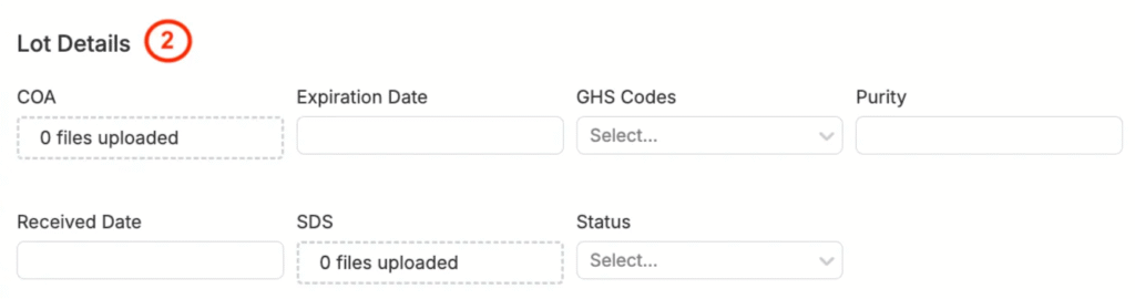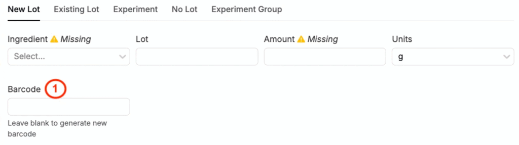 • Manually — If not using a barcode, users can manually enter Lot Details (2). Leaving the Barcode field blank will generate a new barcode.