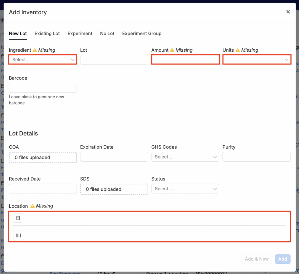 • Inventory Information — when adding to a new lot, existing lot, or “no lot”, select the ingredient and amount, with units. When adding to an experiment or experiment group, select the experiment or experiment group to add to.