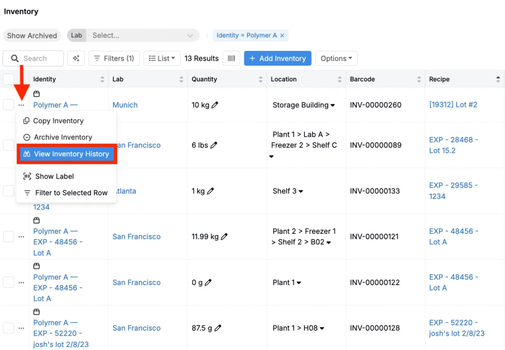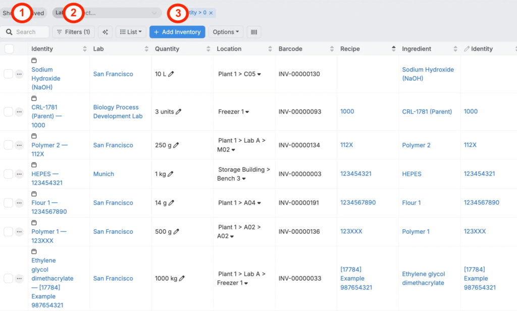 Users can manage their inventory on Inventory listing page (Lab > Inventory), which provides an overview of all inventory within the current material family. Key details, such as lab, location, quantity, ingredient, and associated recipes, are stored and displayed.