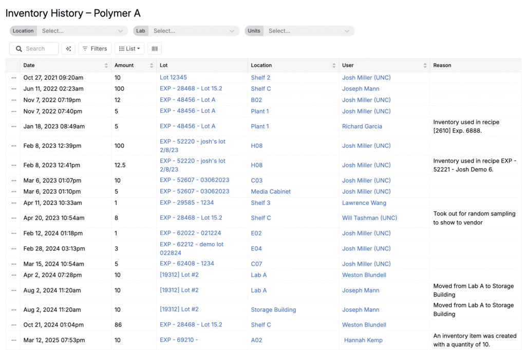 • Reason — the reason for the change in inventory (e.g., “Used in Experiment X,” “Transferred from Lab A to Storage Building,” or “Created with quantity Y”)