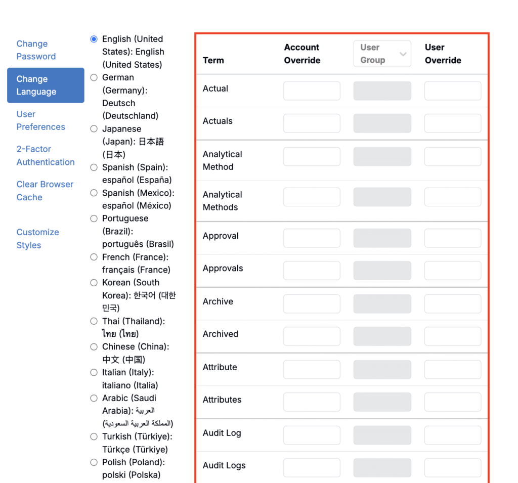 On the right side of the page, you’ll see a table of terms you can edit. Use the appropriate column based on the scope you need:
