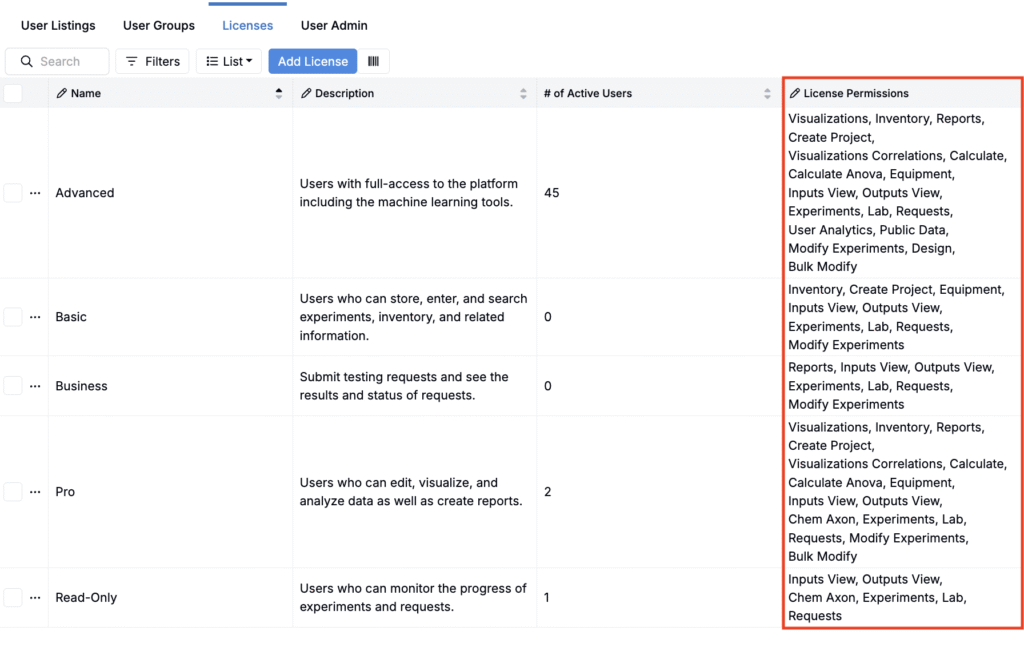 Licenses determine which features of the Uncountable platform a user can access. While user groups and project permissions control what data a user can see or edit, licenses govern what tools and workflows are available once inside the platform.
