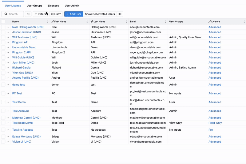 The User Administration page is where admins can manage users and configure licenses and permissions across Uncountable. This article focuses solely on the licenses, set in the User Listing tab. For information on other User Administration page actions, refer to: