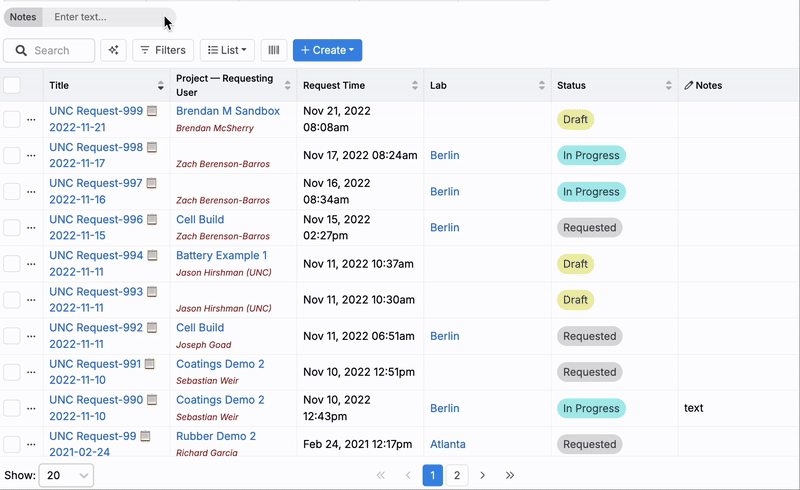 Text Contains filters allow users to filter by matching text values in a specified column. These filters can be added to text-type columns such as Notes, Descriptions, or custom text fields.