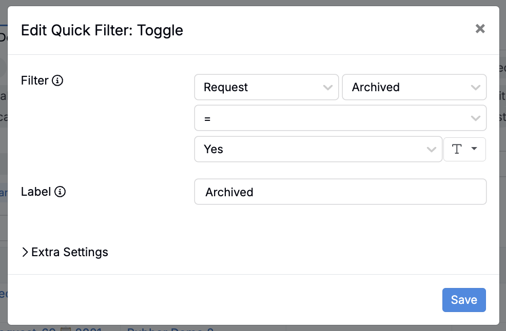 Toggle filters allow users to switch a single filter criterion on or off with a button press. These are best for binary options, such as showing or hiding archived entries.