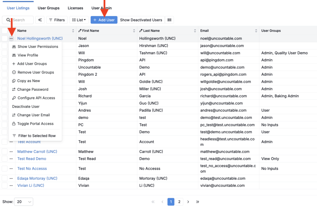 The User Administration page is where admins can manage users and configure licenses and permissions across Uncountable. This article focuses solely on the user management workflow on the User Listing tab. For information on other User Administration page actions, refer to: