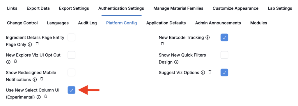 To preview these changes or to opt-in early, admins can turn on Use New Select Column UI in the Platform Config tab of Company-Wide Settings.
