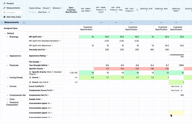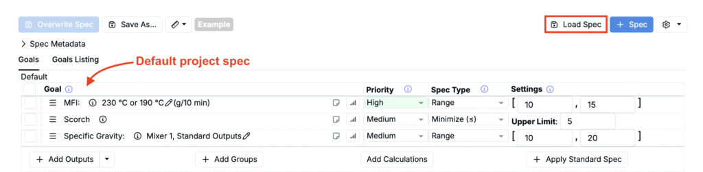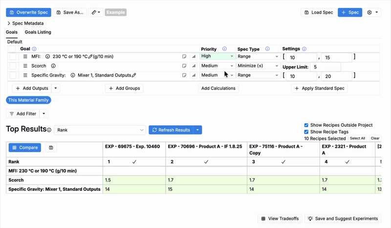 • Spec — A spec defines the goals and limits used to evaluate experiments — for example, desired ranges for density, elongation, and cost. Specs can be saved and reused across projects.
