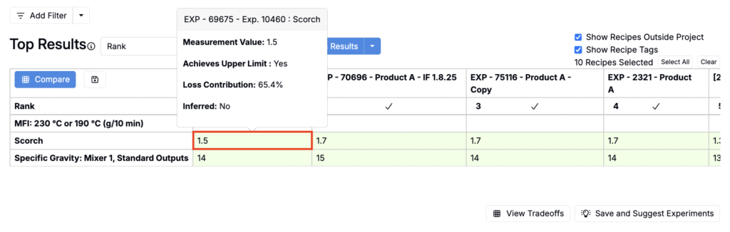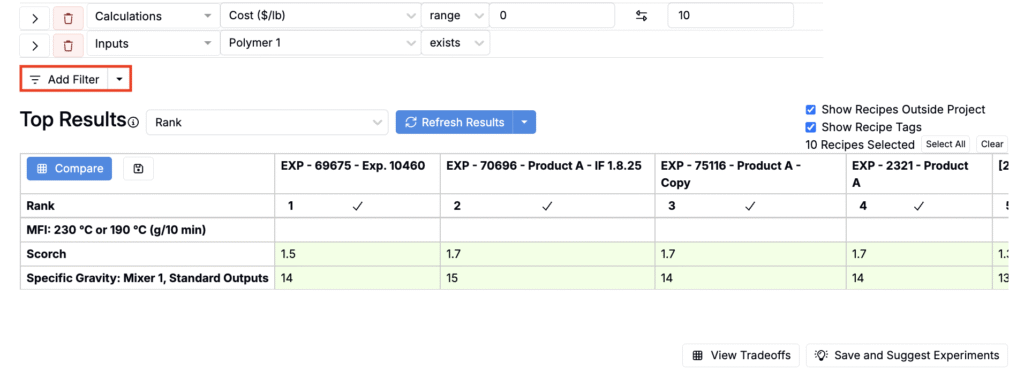 • Use Add Filter to restrict which experiments are evaluated (e.g., include only a certain polymer or cost range).
