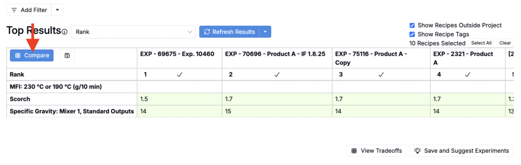 Click Compare to open a detailed comparison of the top-ranked experiments.