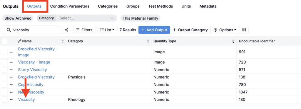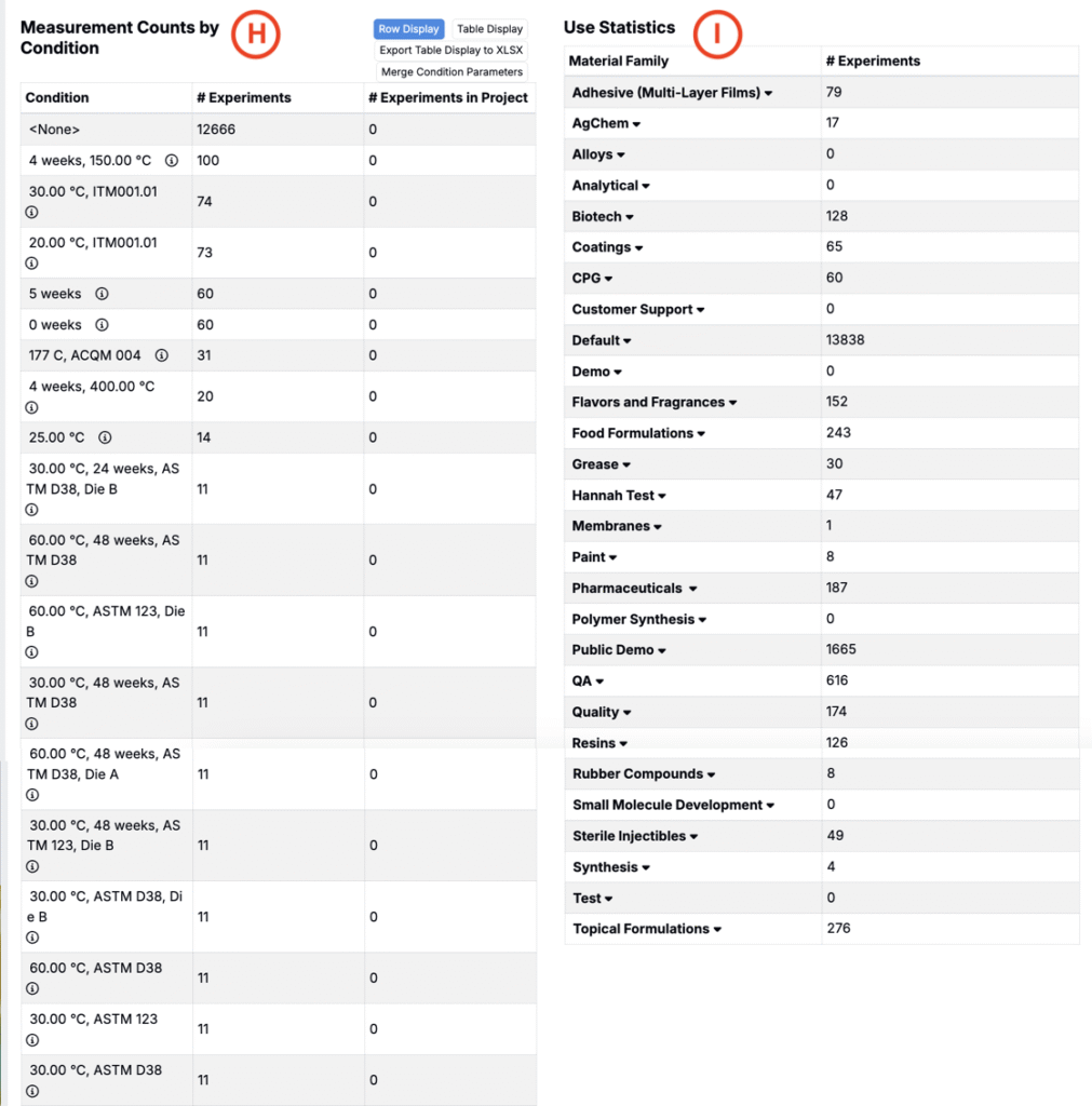• Use Statistics (J) Displays how many experiments within each material family include this output.
