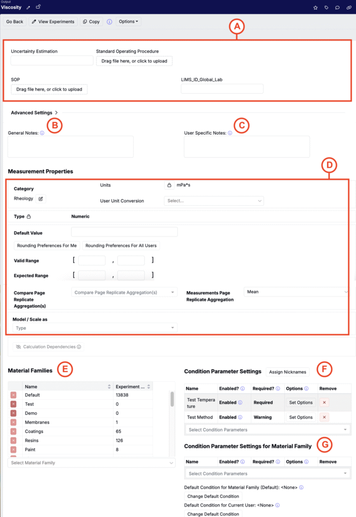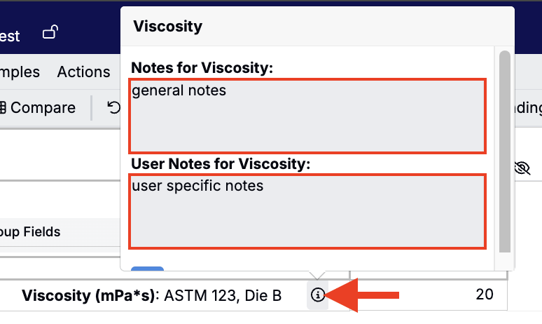 • General and User-Specific Notes Notes can be added to provide additional context about an output. General Notes (B) are visible to all users, while User-Specific Notes (C) are private to the user who created them. Both types of notes appear on the output’s details page and in the output info popover on Enter Measurements. See example screenshot below.