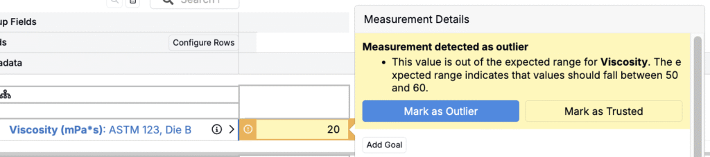 • Valid and Expected Ranges – Define acceptable value ranges. If a recorded value falls outside of the range, the measurement cell will be flagged with a warning and users will have the option to mark it as an outlier. See example screenshot below.
