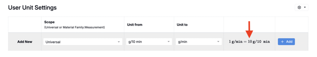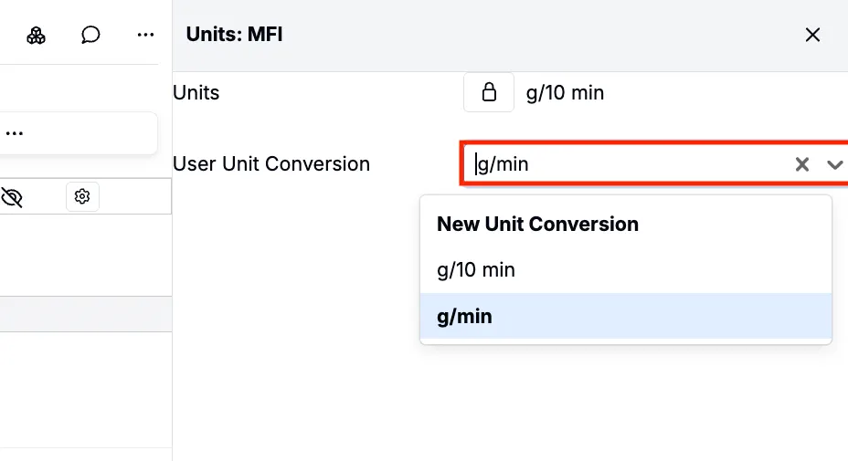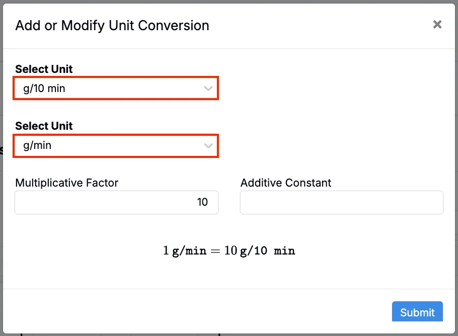 - Selecting a Unit from (e.g. g/10 min).