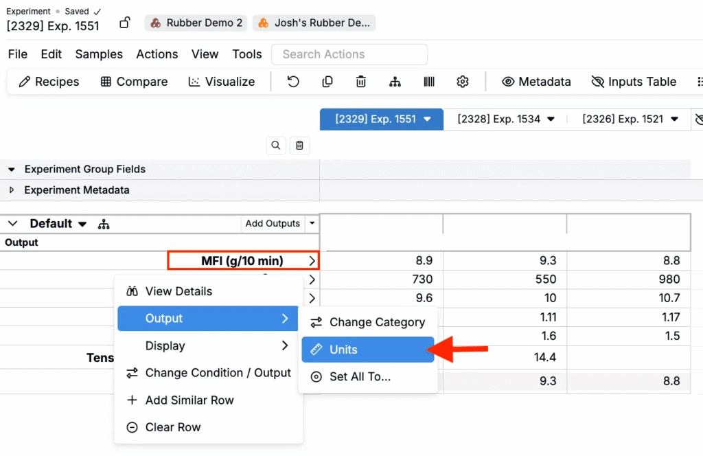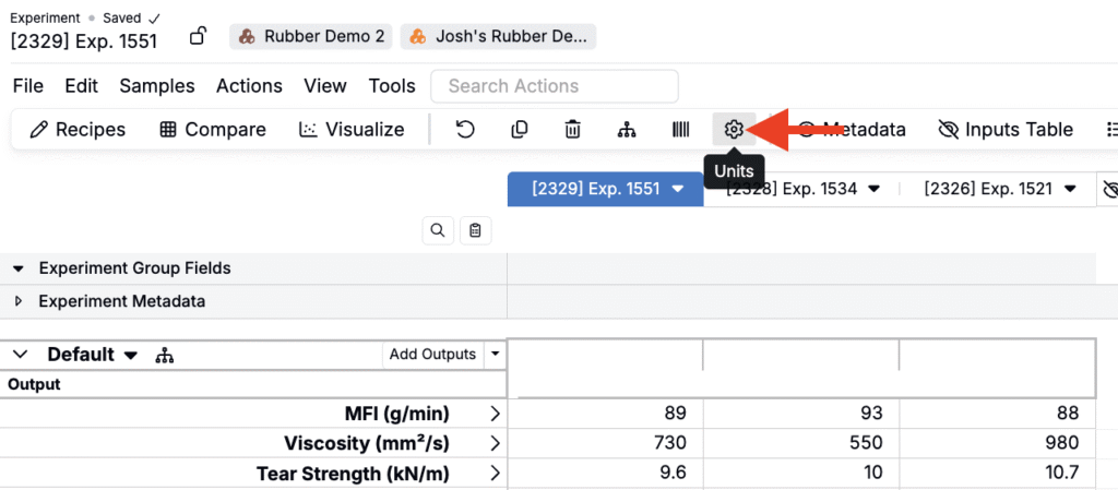 - On the Measurements view of an experiment or experiments, click the ⚙️ icon or search for “Unit Conversion Settings.”