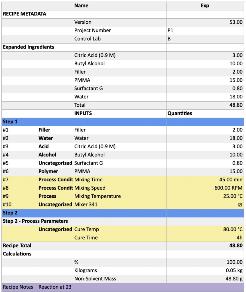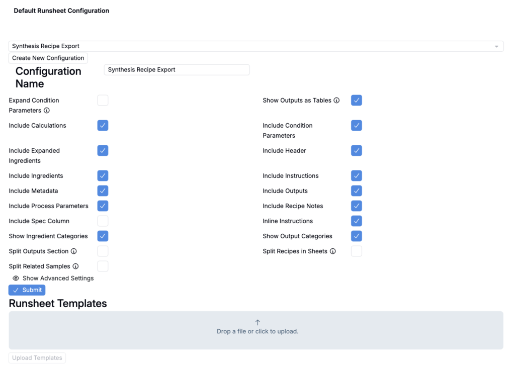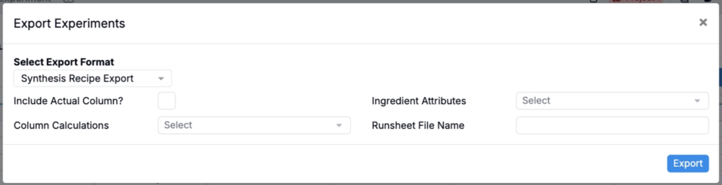 Runsheets are configurable recipe exports that let you download a structured view of recipe and experiment data (for example ingredients, process parameters, outputs, and other metadata) into a shareable file.