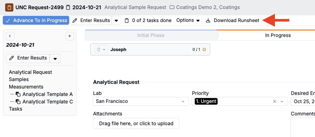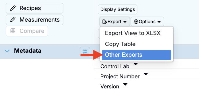Once runsheets are configured, users can export them from the Recipe, Measurements, Compare, or Lab Request pages.