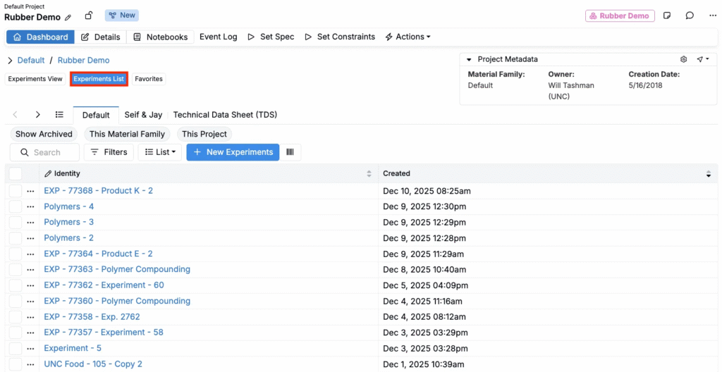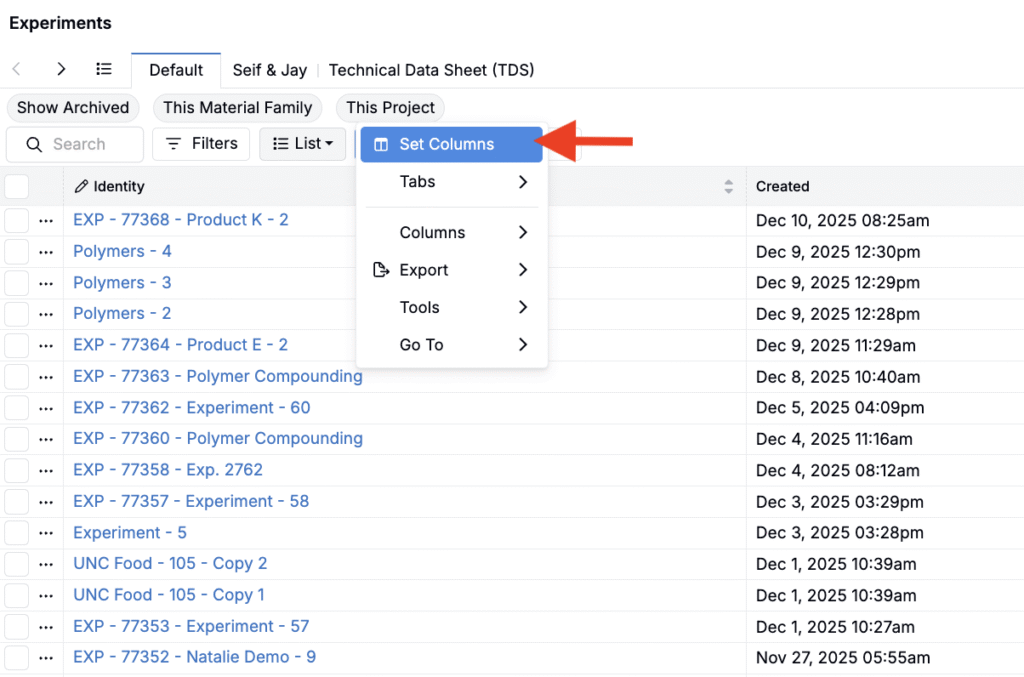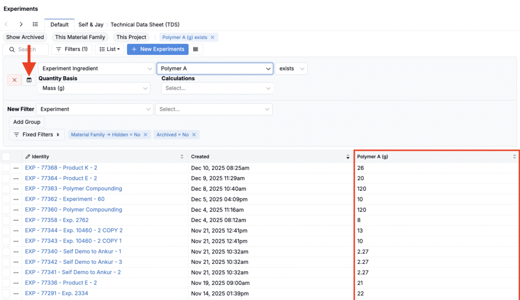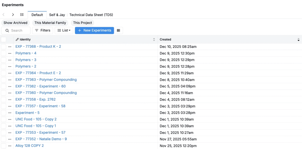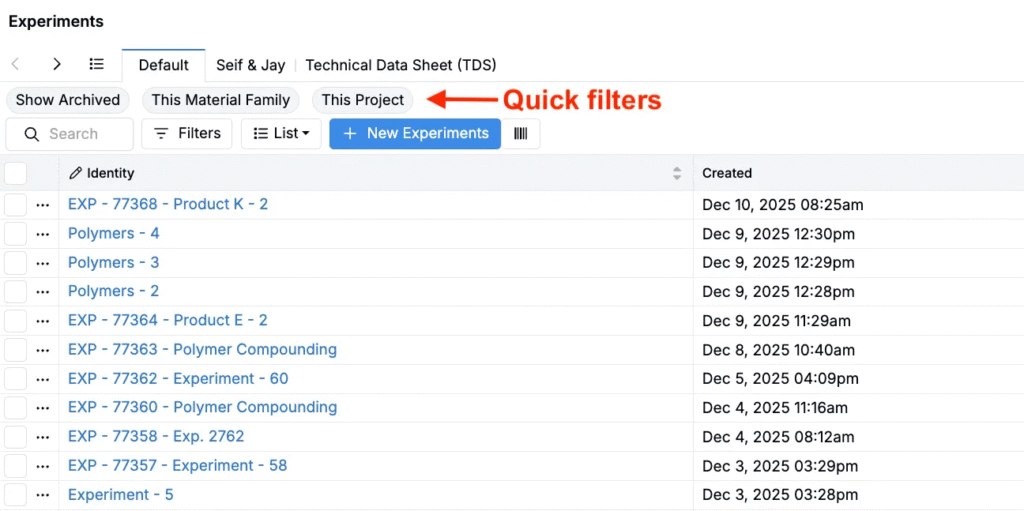 • Type — filter by experiment type (recipe, quality recipe, lot, test sample, build, analytical recipe)