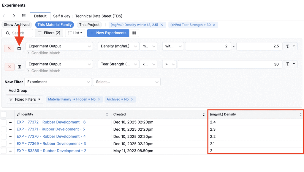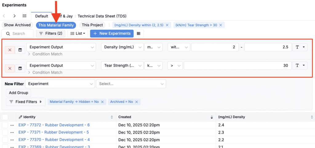 If you have a clear goal and want Uncountable to surface strong candidates automatically, you can also use Objective Search. Instead of filtering field-by-field, Objective Search helps you find relevant experiments, recipes, and measurements based on an objective (e.g. “Maximize tensile strength while keeping viscosity below X”).
