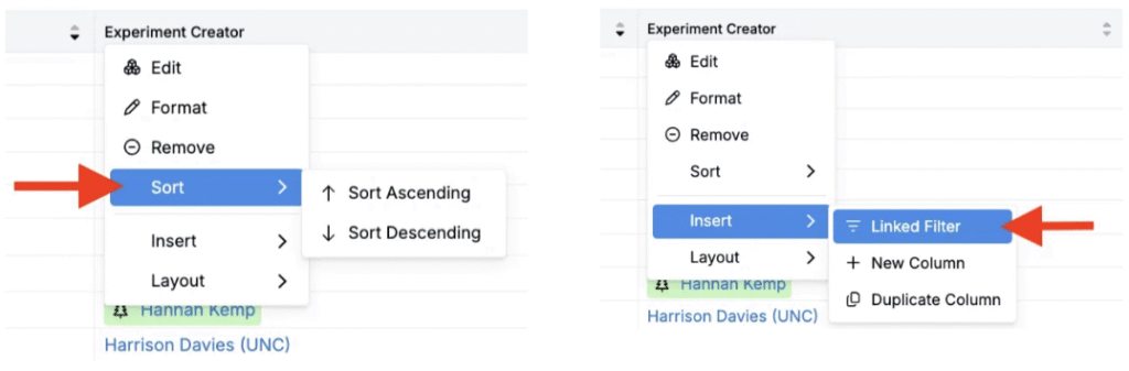 • Listing views are built for exploration. The Experiment List view support custom columns, sorting, and quick filters.