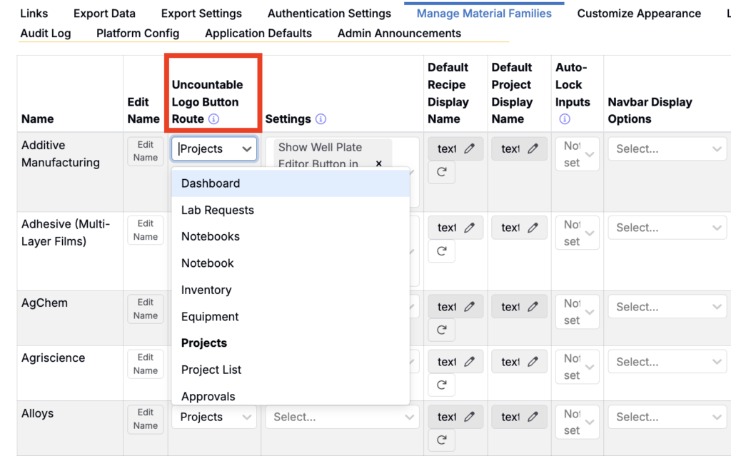 - Once saved, clicking the Uncountable logo will direct all users in that material family to the selected page.