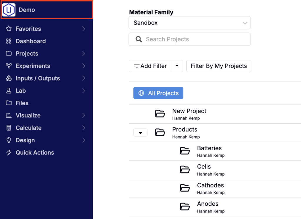 In Uncountable, selecting your company name or the logo in the top navigation bar takes you to your homepage. Each material family can have its own homepage, so different teams can land on the page that best matches their workflow.