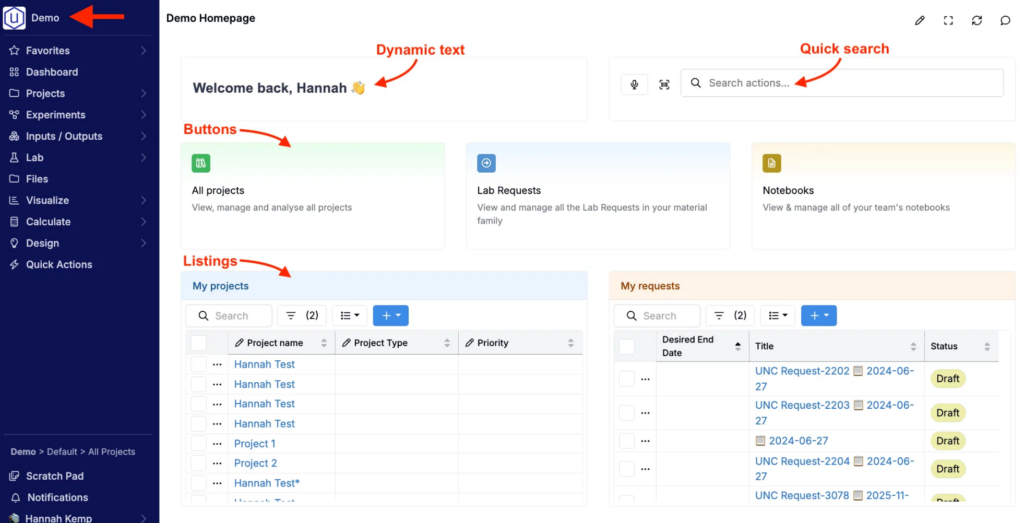 These custom homepages are built using dashboard notebooks and can include elements like quick links, search, and personalized listings. For setup steps and examples, see Custom Uncountable Homepages.
