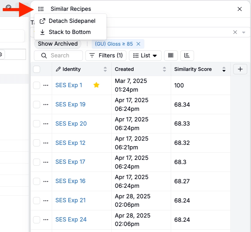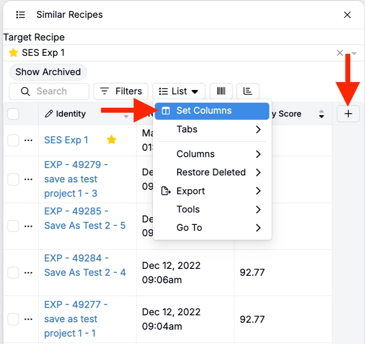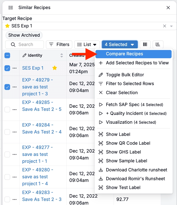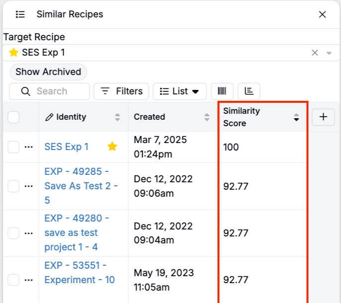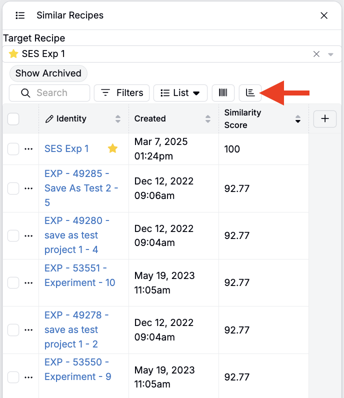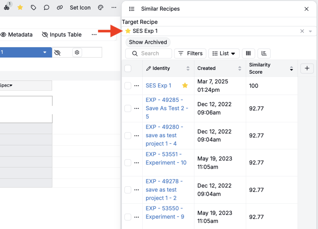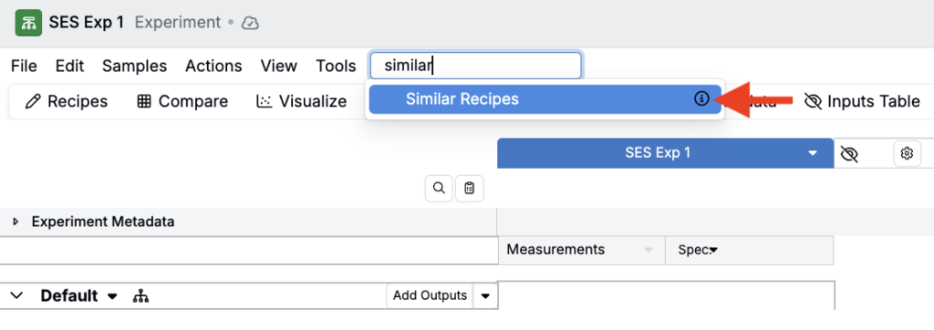 - Check before you run: Before creating a new experiment, run Similar Recipes on your active recipe to see whether something close already exists.