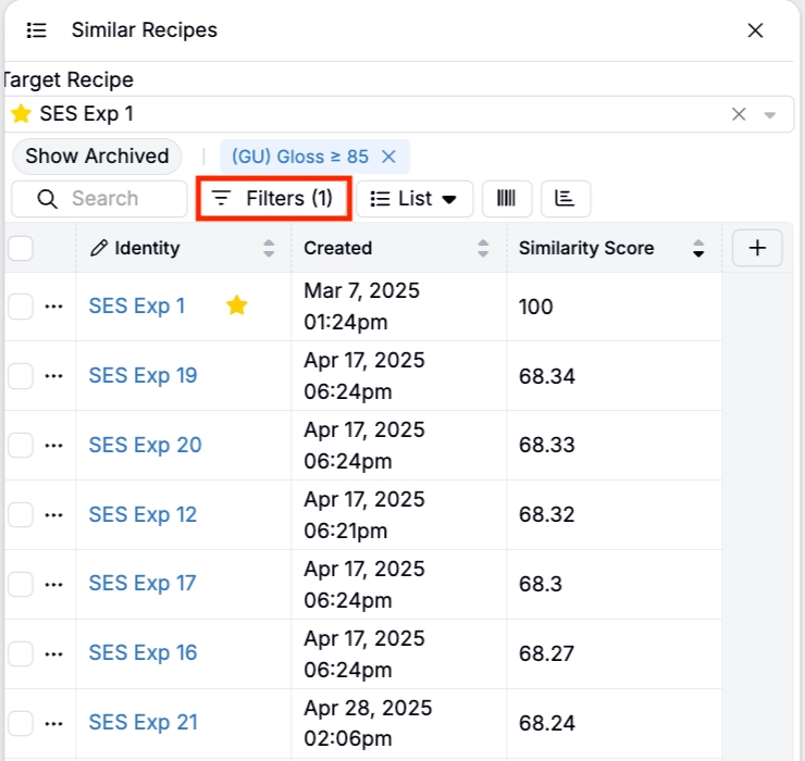 - (Optional) Add filters to refine your results. For example, filter to experiments within a specific project, experiments that contain specific inputs, or experiments with a specific measured output (e.g. Gloss ≥ 85).