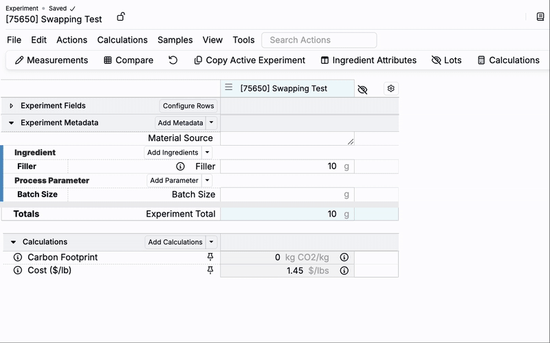 When you select Swap Similar Ingredient from an ingredient’s menu in the recipe view of an experiment, the replacement options are limited to ingredients that have been manually defined as similar. These relationships are set up in advance via Similar Ingredient Tags.