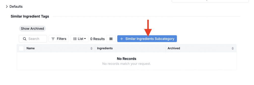 - Locate the Similar Ingredient Tags section and click + Similar Ingredient Subcategory.