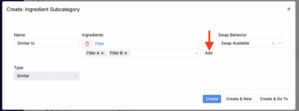 - In the modal, use the Ingredients field to select ingredients that are similar to the base ingredient and click Add.