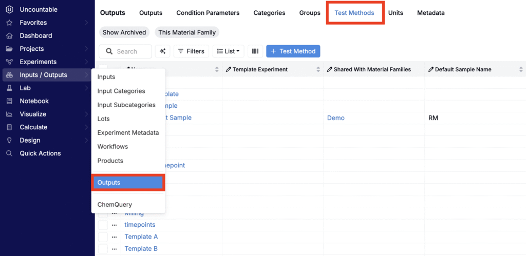 You can manage Test Methods from the Test Methods page under Inputs / Outputs > Outputs, and favorite commonly used ones for quick selection during sample creation. Note that you will need Write Outputs permissions within the current material family in order to create new and manage existing Test Methods.