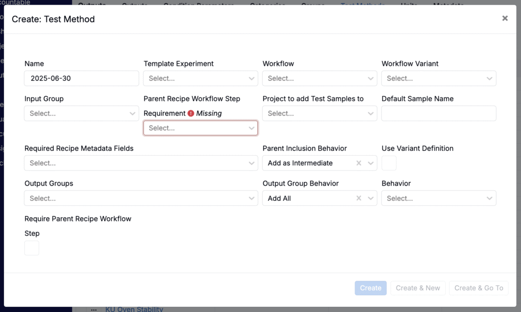 - Required Recipe Metadata Fields: List any metadata fields that must be filled out before the sample can be created.