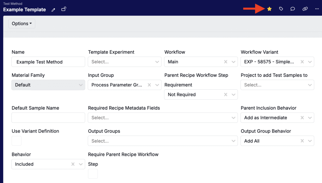 Once created, you can also favorite Test Methods that you use frequently by clicking the star icon in the top banner. Favorited Test Methods will appear at the top of selection dropdowns (on Measurements page and Lab Requests).
