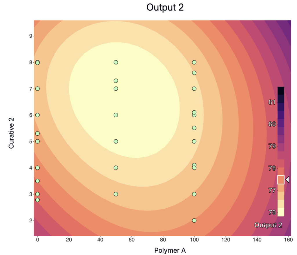 2D cross-section of the Analyze model showing predicted output vs. two inputs; green points are the historical experiments used to train the model