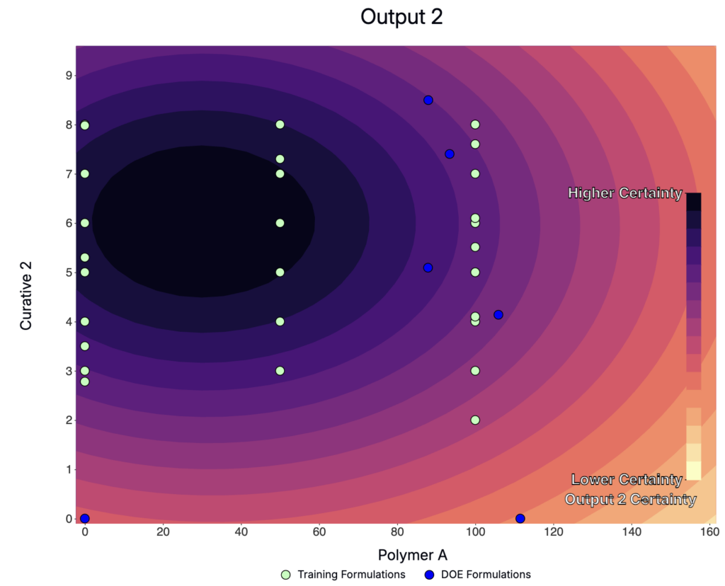 Model certainty map from a Suggest run, with historical experiments (green) and AI‑suggested next experiments (blue)