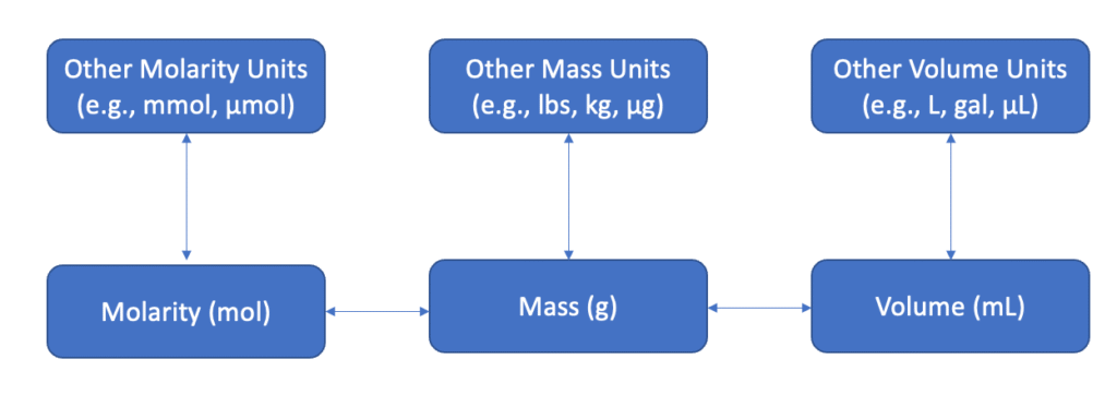 Basis units in Uncountable allow users to add ingredients into experiments using three different basis unit families — Mass, Molarity, and Volume. Each family also has a default unit — g, mol, and mL respectively.