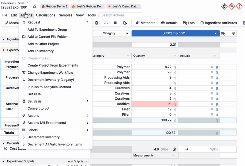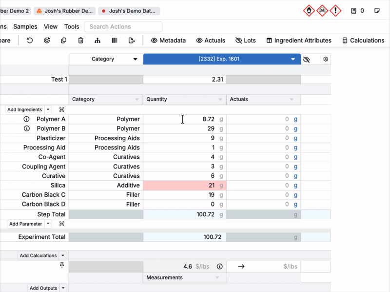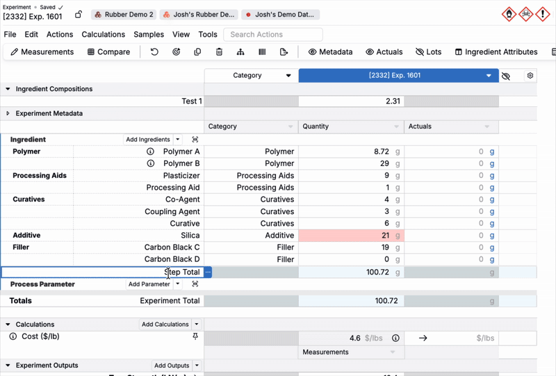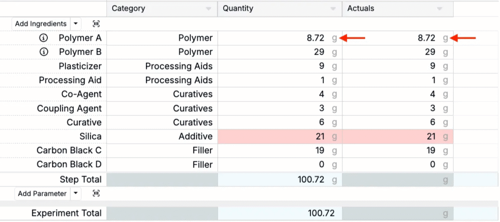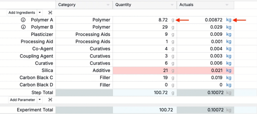 Basis units for Actual values can be set at the ingredient, workflow step, or material family-level.