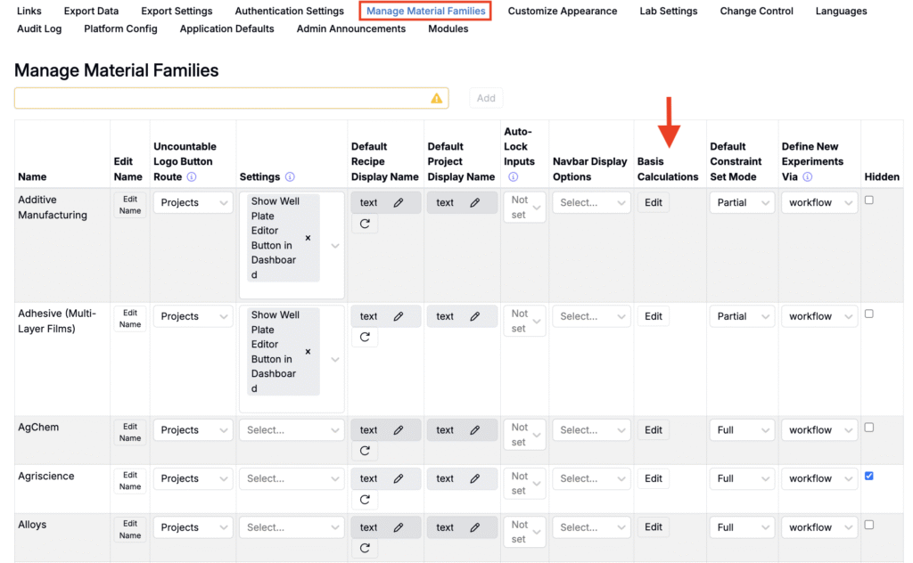 - Click Edit in the Basis Calculation column of a material family row.