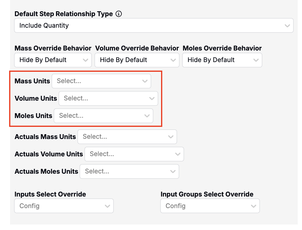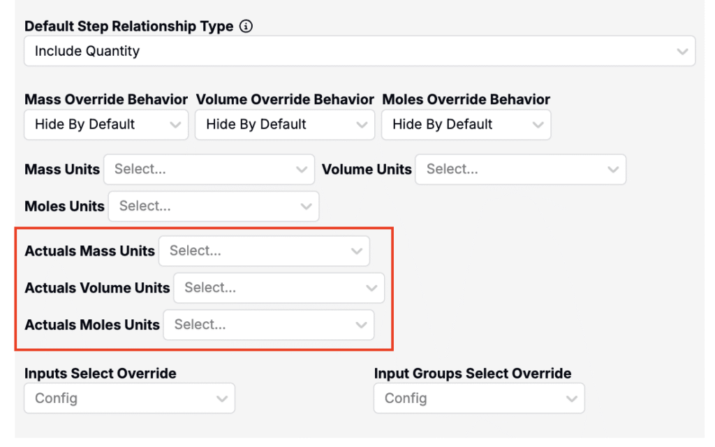 - On a workflow step, use the Actual Mass, Volume, and Moles Units fields in the workflow step editor Advanced Settings.