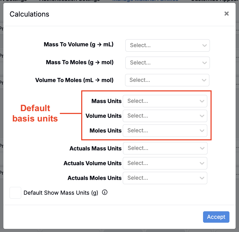 - In the modal, use the Mass, Volume, and Moles Units fields to select your default basis unit for each family.