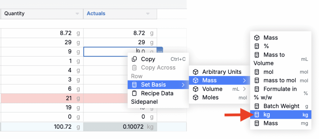 - Use the Quantity Basis menu to select a new default unit for that ingredient cell