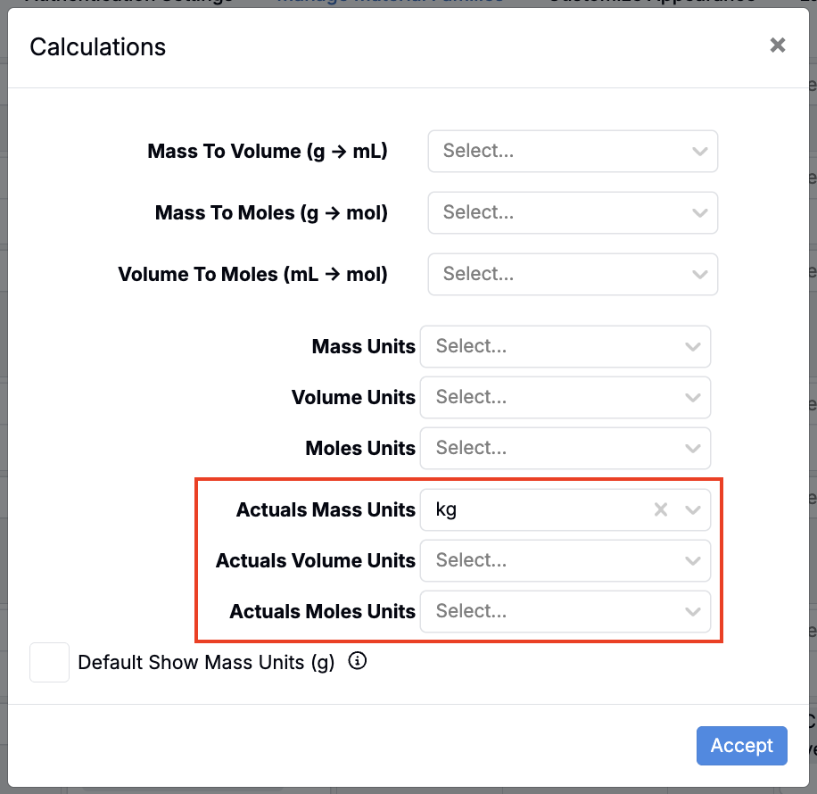 - For a material family, use the Actual Mass, Volume, and Moles Units fields in Basis Calculations modal (Company-Wide Settings > Manage Material Families).