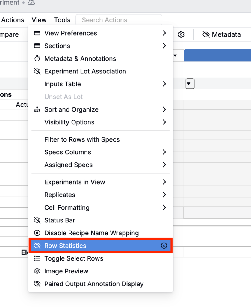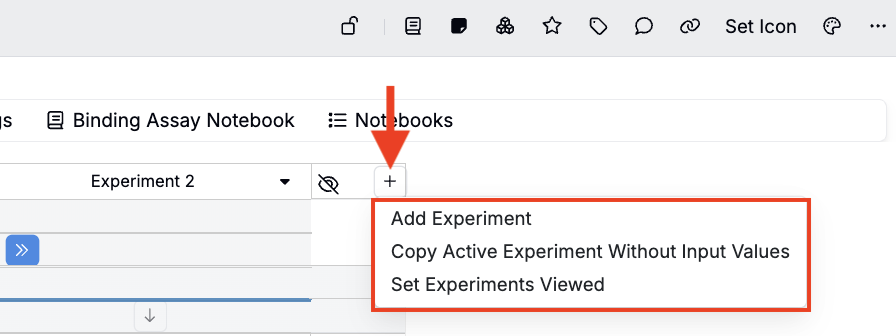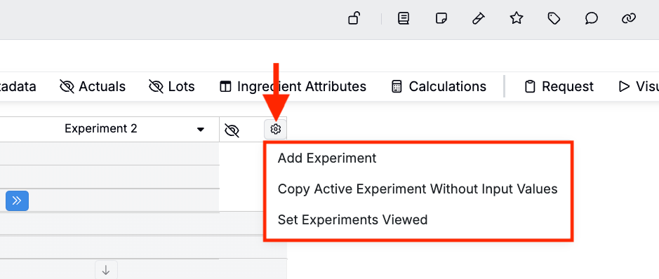 Previously, the Recipe header showed a ⚙️ icon that opens a menu of actions for managing experiments — including Add Experiment, Copy Active Experiment Without Input Values, and Set Experiments Viewed.
