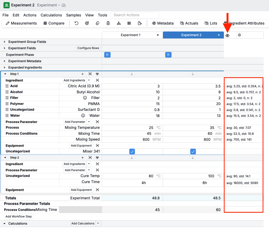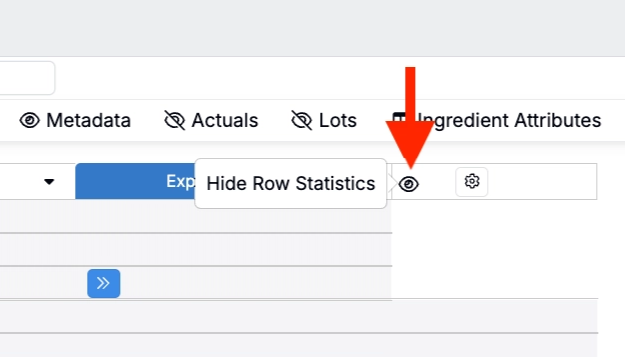 The Recipe header also contains a row statistics toggle (👁️ icon). Clicking it will show/hide an additional column with average, standard deviation, and n values for each row.