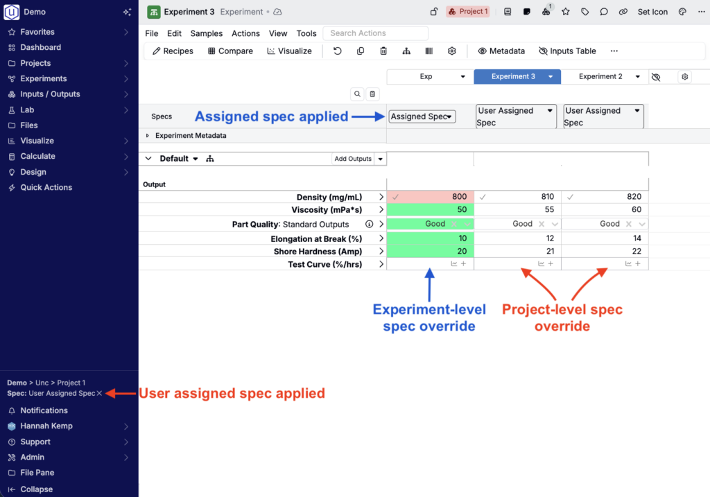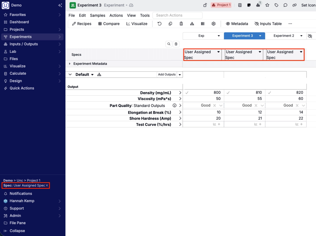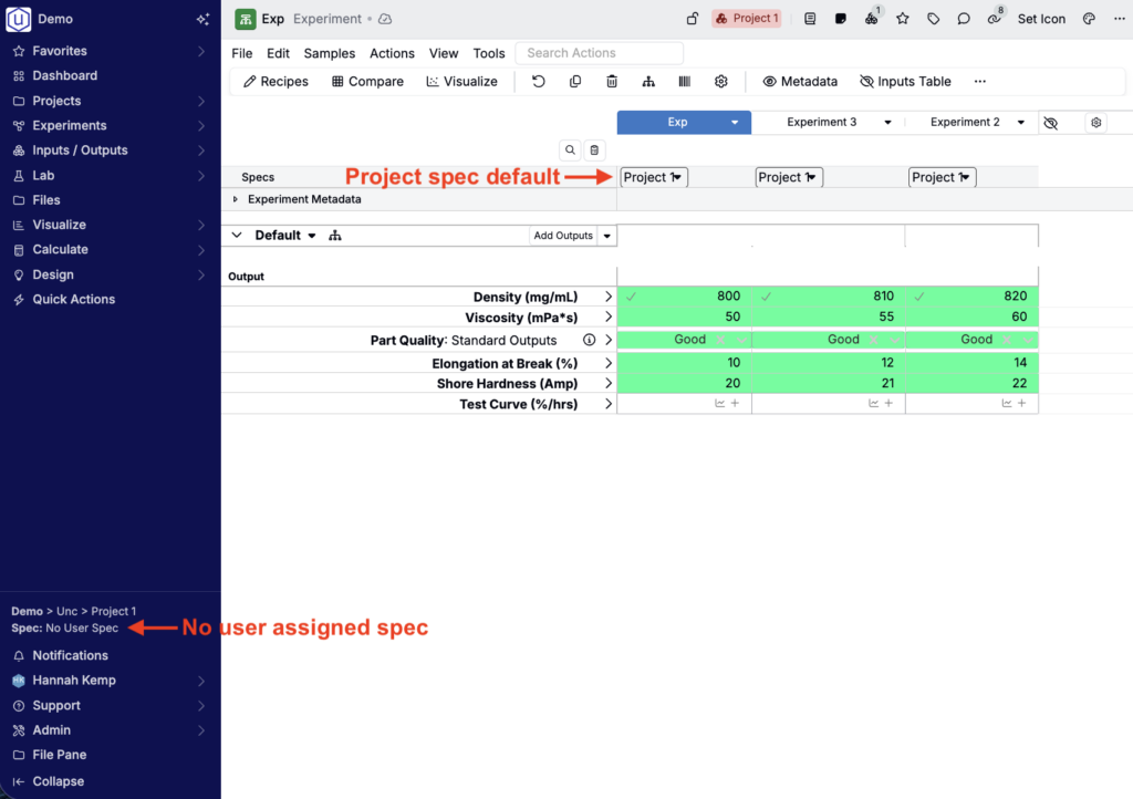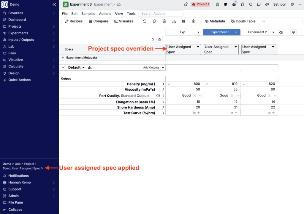 A user assigned spec is a personal spec selection that applies to an individual user without changing the project default. When a user assigned spec is selected, Uncountable uses that spec for the viewing user’s analysis experience. Other users in the project can keep their own spec selections, and the project default spec remains unchanged.